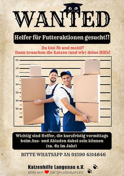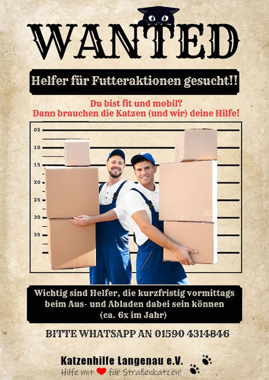 Für Futteraktionen – Anlieferung von Paletten, Abholung Bruchware etc. – suchen wir fitte und mobile Leute, die den Straßenkatzen etwas Gutes tun möchten. Unser Umschlag im Jahr liegt bei 15 – 17 Tonnen Nassfutter. Damit versorgen wir täglich rd. 200 Straßenkatzen an über 20 Futterstellen. Dieses Futter müssen wir entweder selber abholen oder es wird in Paletten (oft vormittags) angeliefert und muss meistens sofort abgeladen werden.